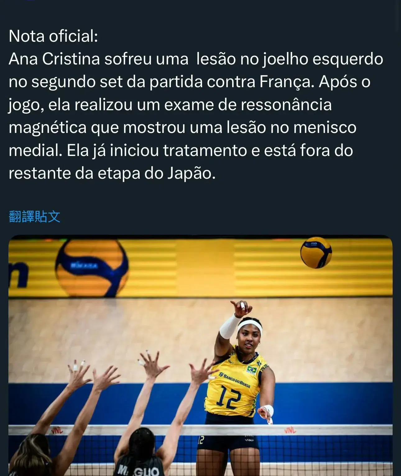 克里斯蒂娜效力于土耳其的费内巴切女排,也就是袁心玥被爆将要在新赛季加盟的球队,贝格曼在土耳其航空女排,虽然巴西女排最终3:2五局大战险胜世界排名15名以后的法国女排,然而这场比赛本应该轻松拿下,结果在法国一姐卡绍特的努力下,巴西女排打的还是比较辛苦,但是在比赛中巴西女排的主攻克里斯蒂娜遭遇了严重的伤病,在无接触的情况下受伤倒地,最后被轮椅推出了场外,而在她之前保加利亚女排的自由人也受伤,中国女排的吴梦洁有惊无险的崴脚。